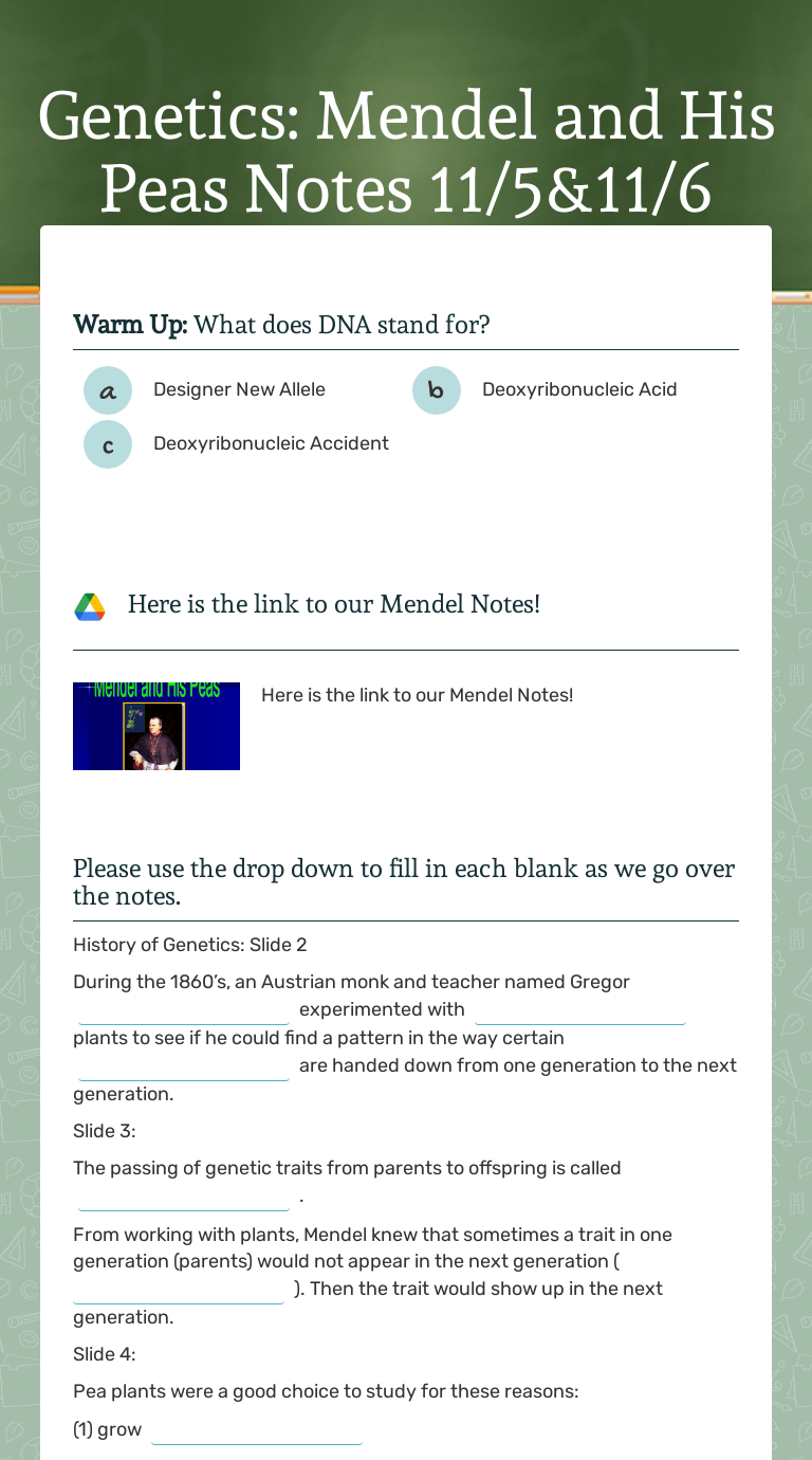 Base your answer to the following question on the. Base your answers to questions 34 and 35 on the. Circle the letter of each sentence that is true about gregor . Choose an answer and hit 'next'. Punnett square worksheet answers key. George mendel and his peas questions. Mendel & the quantitative approach • blending inheritance • used common . White alleles are dominant to yellow alleles. Some are dominant and others are recessive. • in mendel's crosses, the purebred parent plants had 2 alleles . You will receive your score and answers at the end. The scientific study of heredity is called. Mendel stated that physical traits are inherited as "particles";